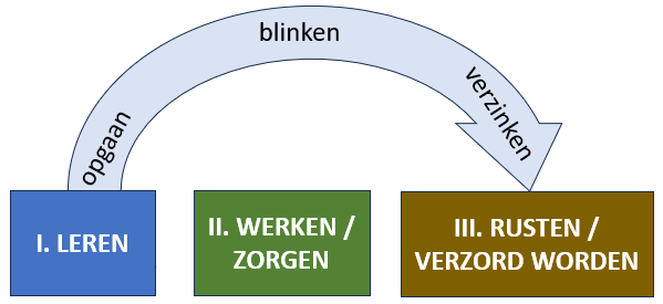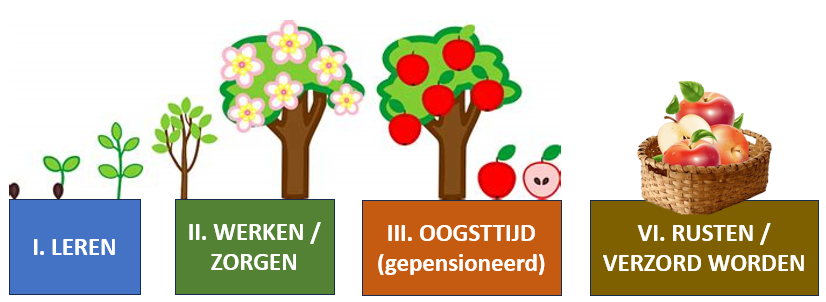 In de jaren tachtig van de vorige eeuw was de levensloop georganiseerd rondom drie levensfasen: jeugd, volwassenheid en ouderdom. De eerste fase stond in het teken van leren; daarna werd er gewerkt (mannen) en gezorgd (vrouwen). Ten slotte was het tijd om uit te rusten en verzorgd te worden.